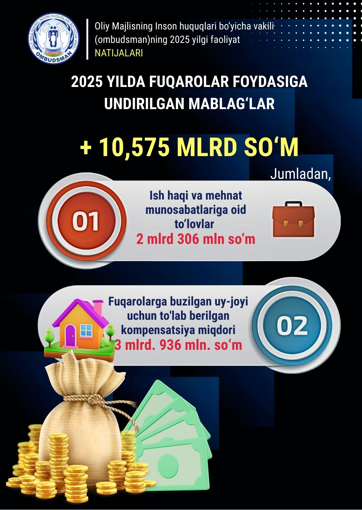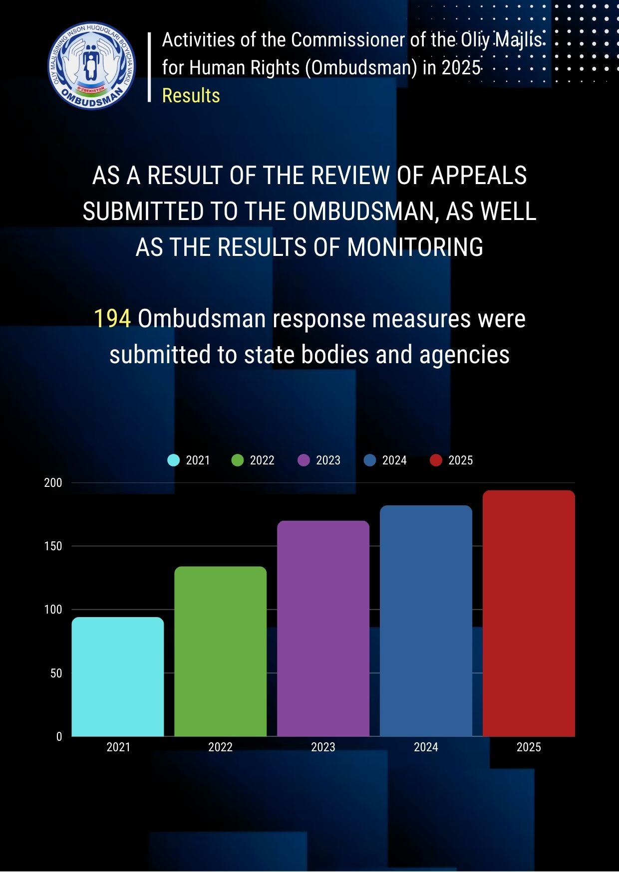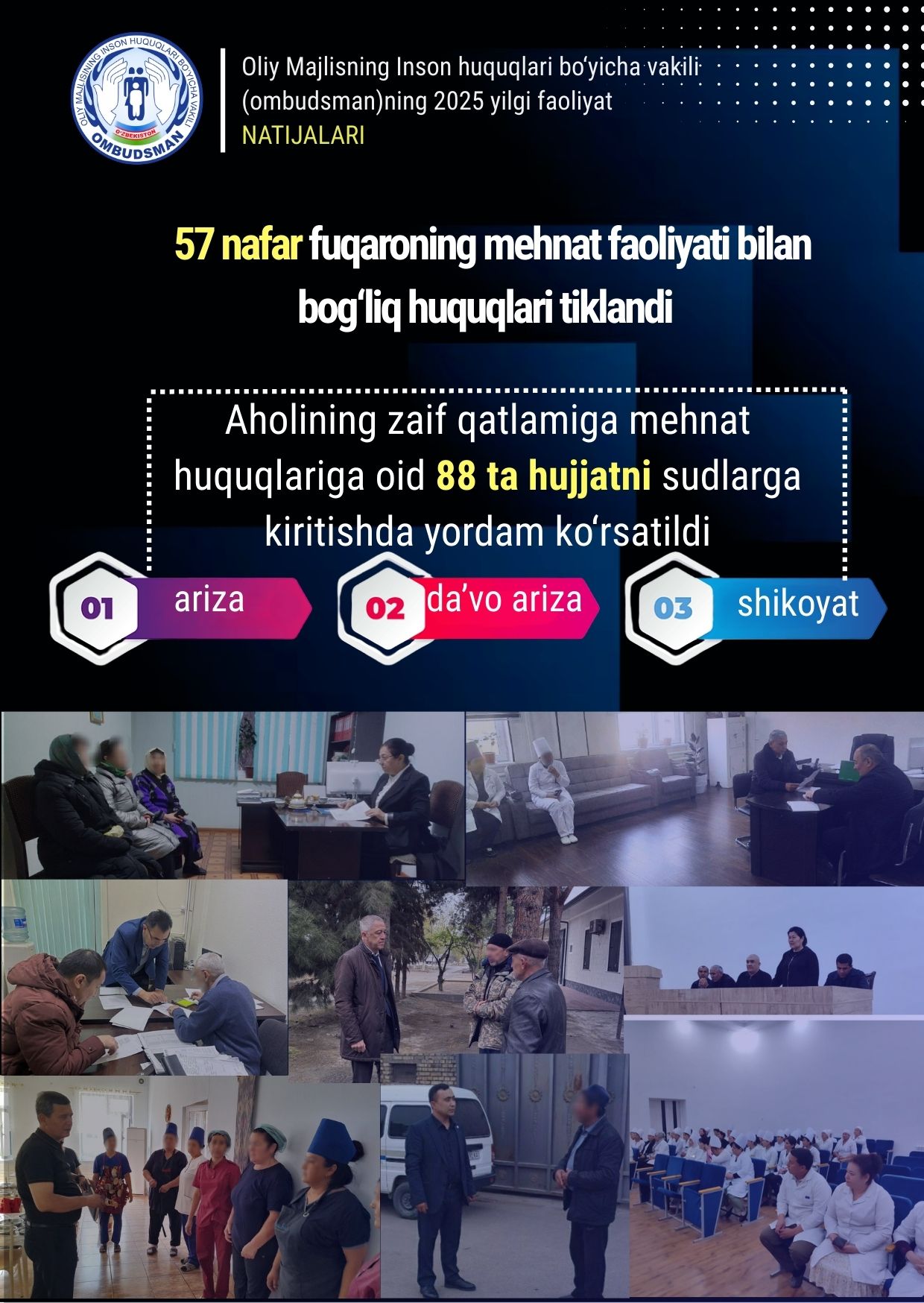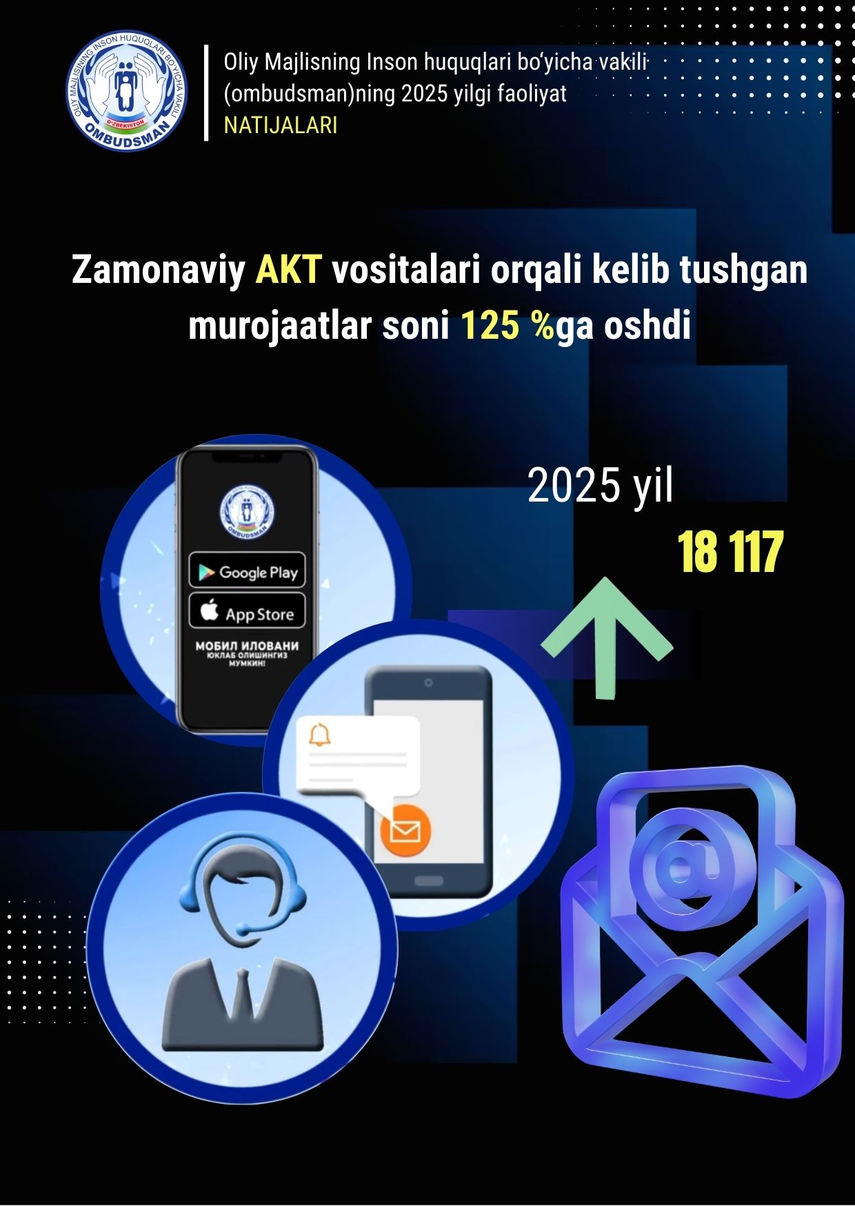 Ўзбекистон Республикаси Олий Мажлисининг Инсон ҳуқуқлари бўйича вакилининг Интернет-қабулхонасида сиз Омбудсман ваколатига кирувчи савол билан мурожаат қилишингиз, унга жавоб олишингиз мумкин.